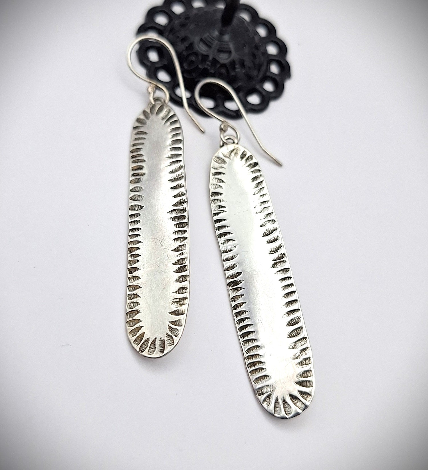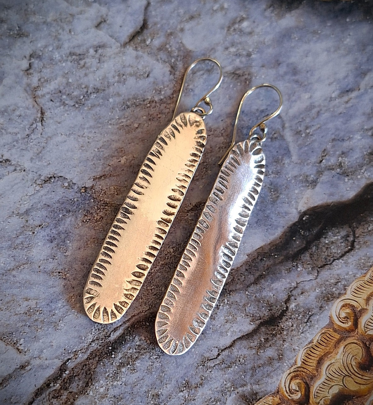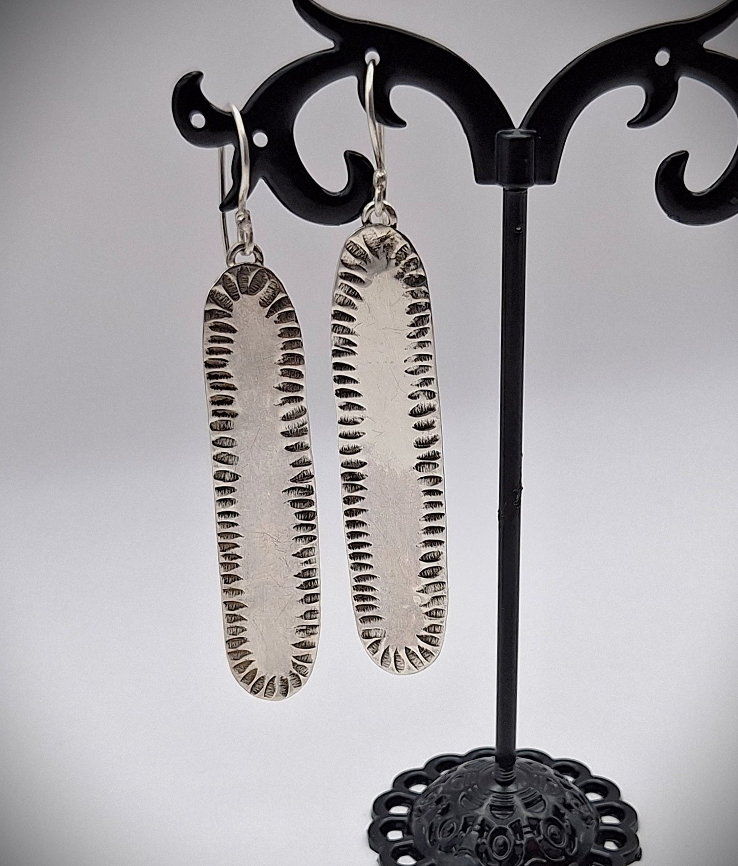 Aros colgantes largos hechos a mano, trabajo de cuño sobre metal.