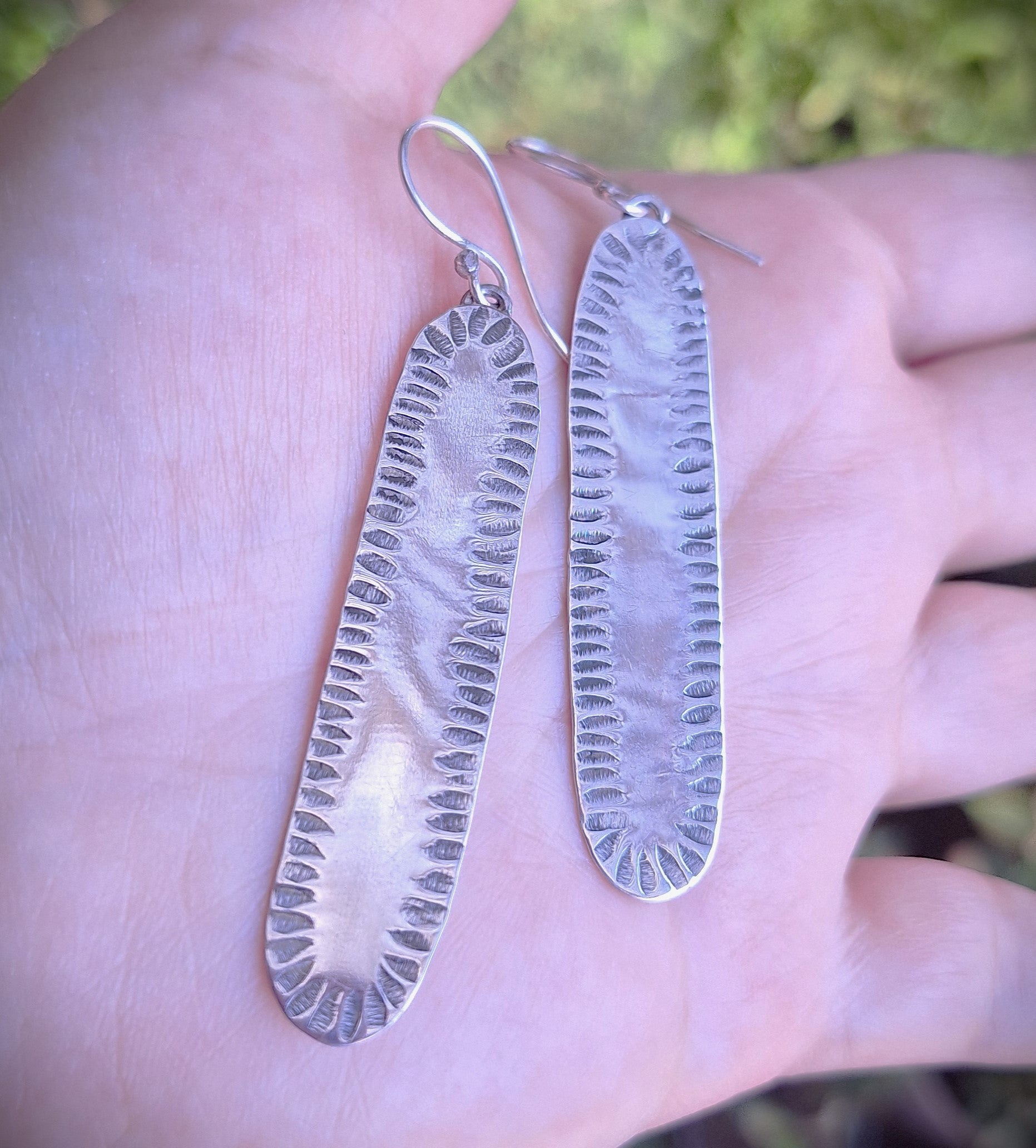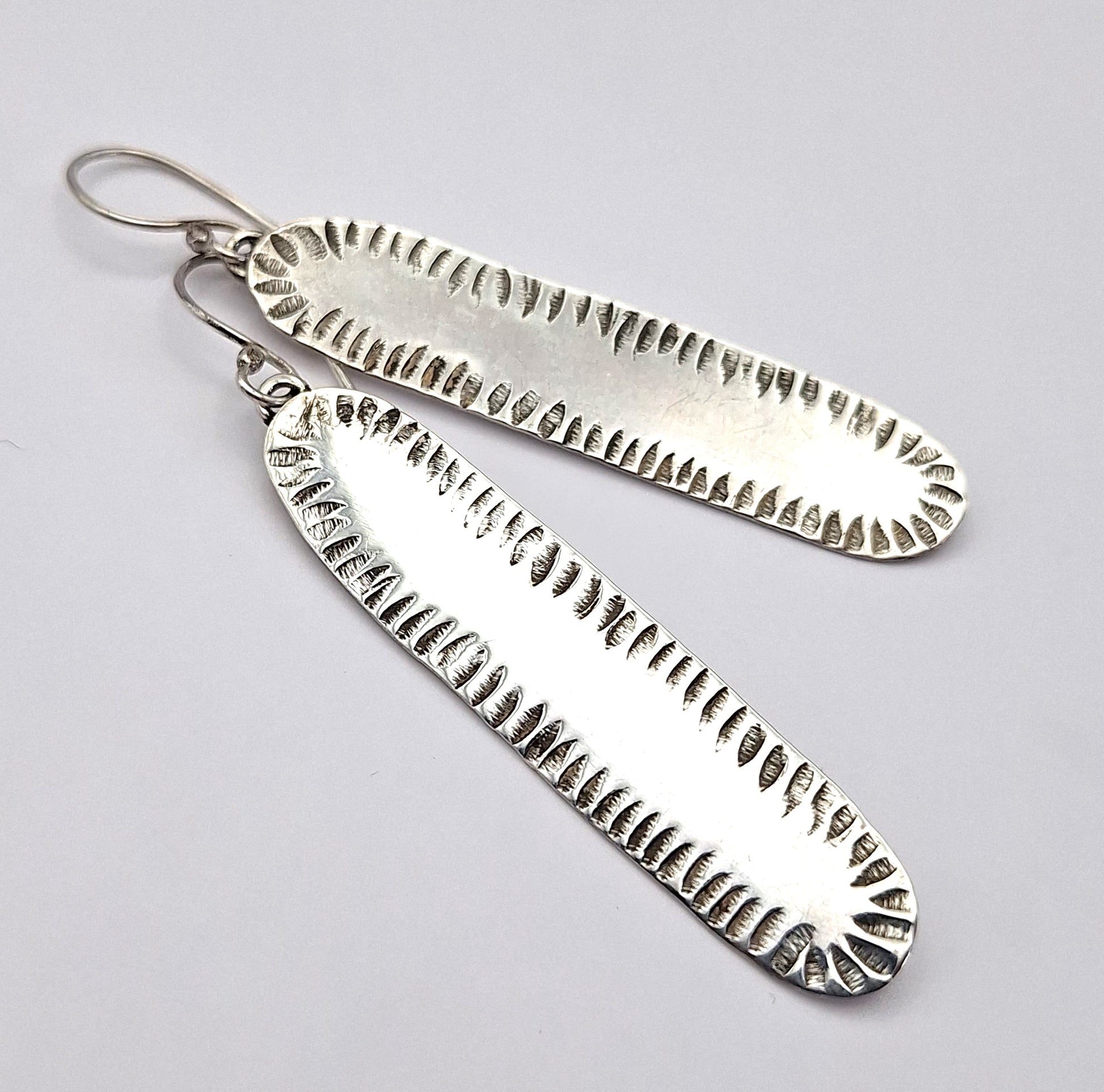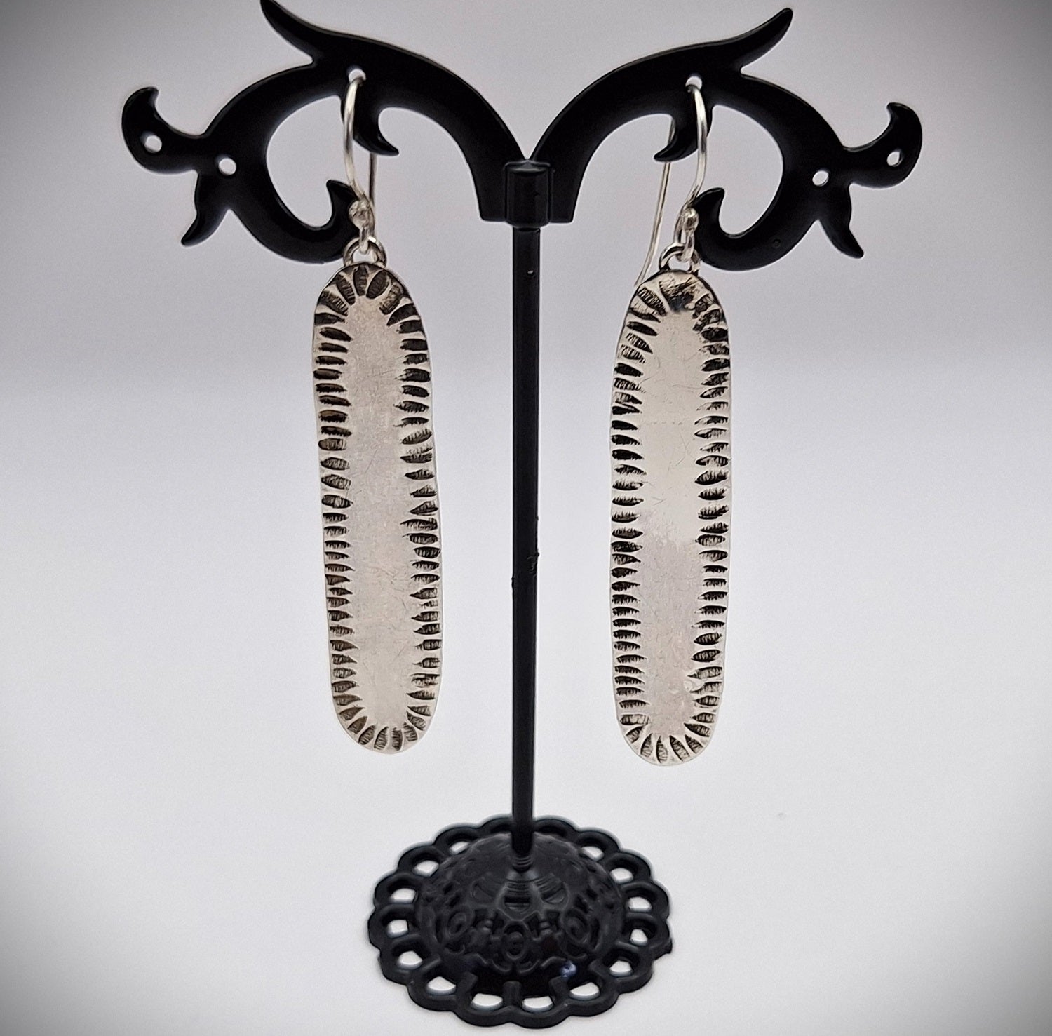 Aros colgantes largos hechos a mano, trabajo de cuño sobre metal.