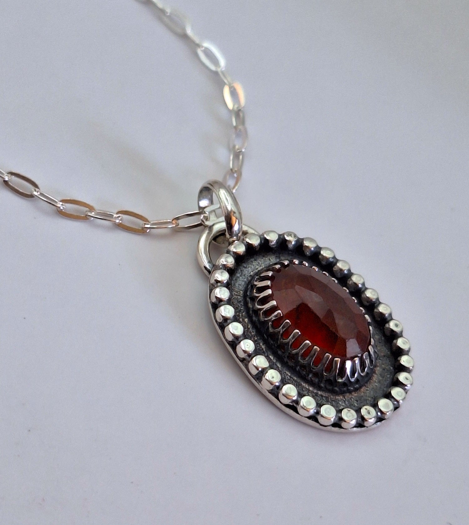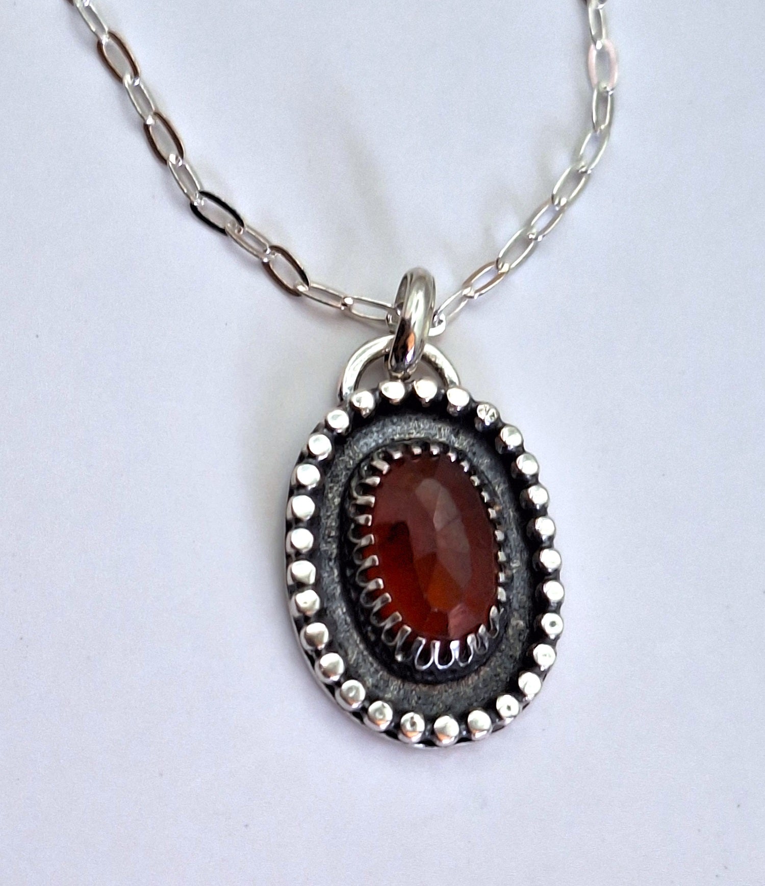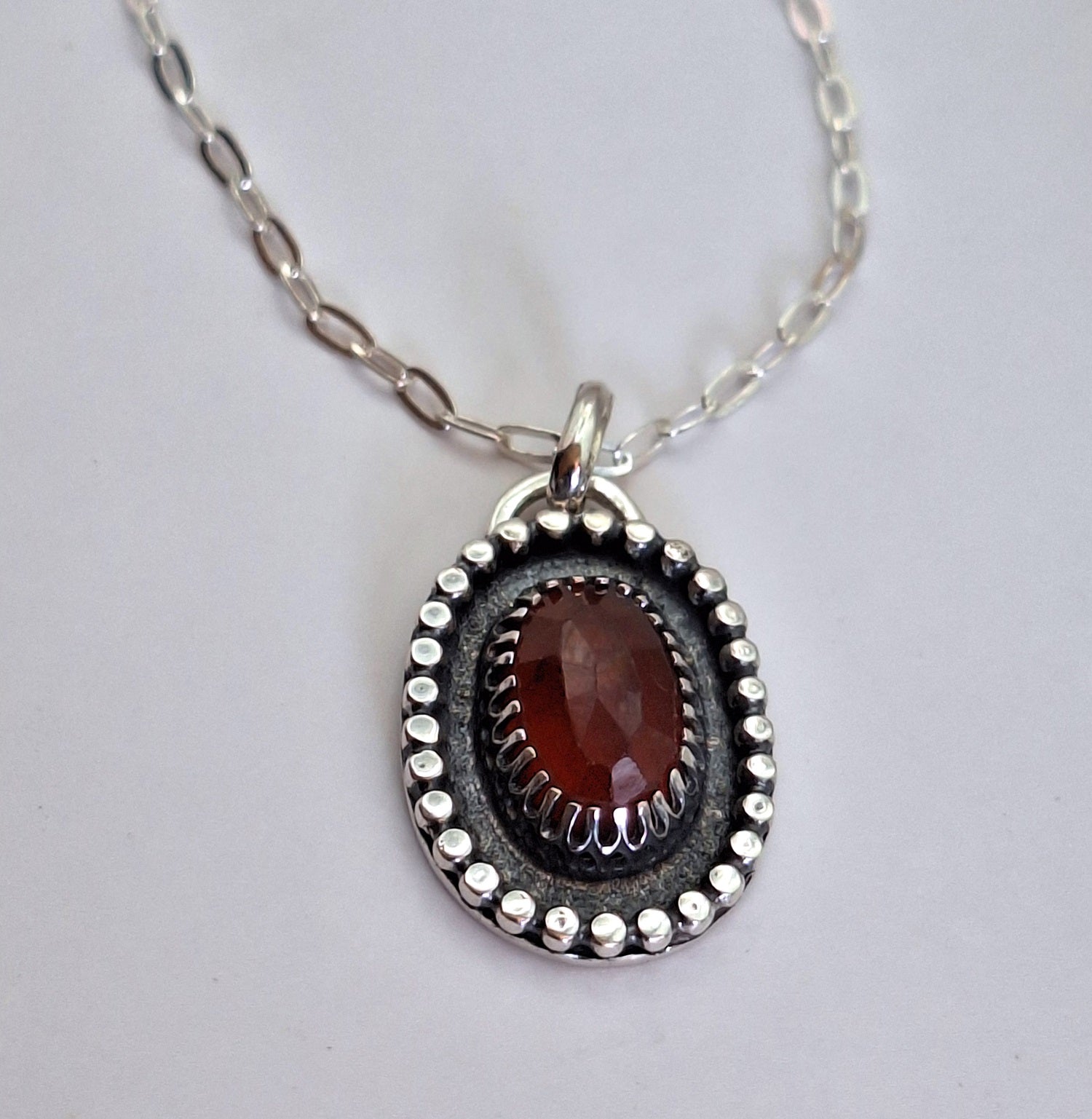 Colgante pequeño, hecho a mano, engaste de piedra natural Granate Hessonita. Incluye cadena de 45 cms. plata 925. Pieza única.
