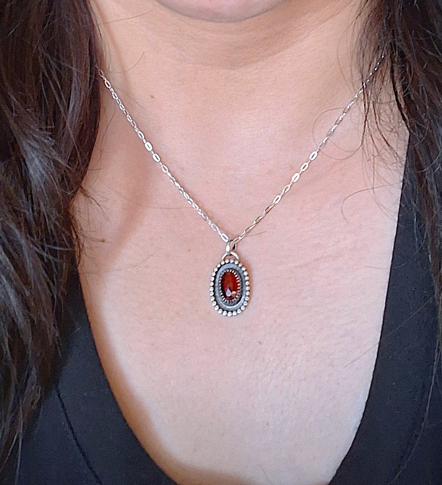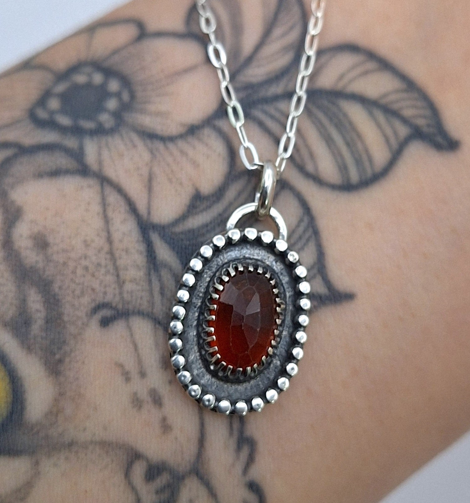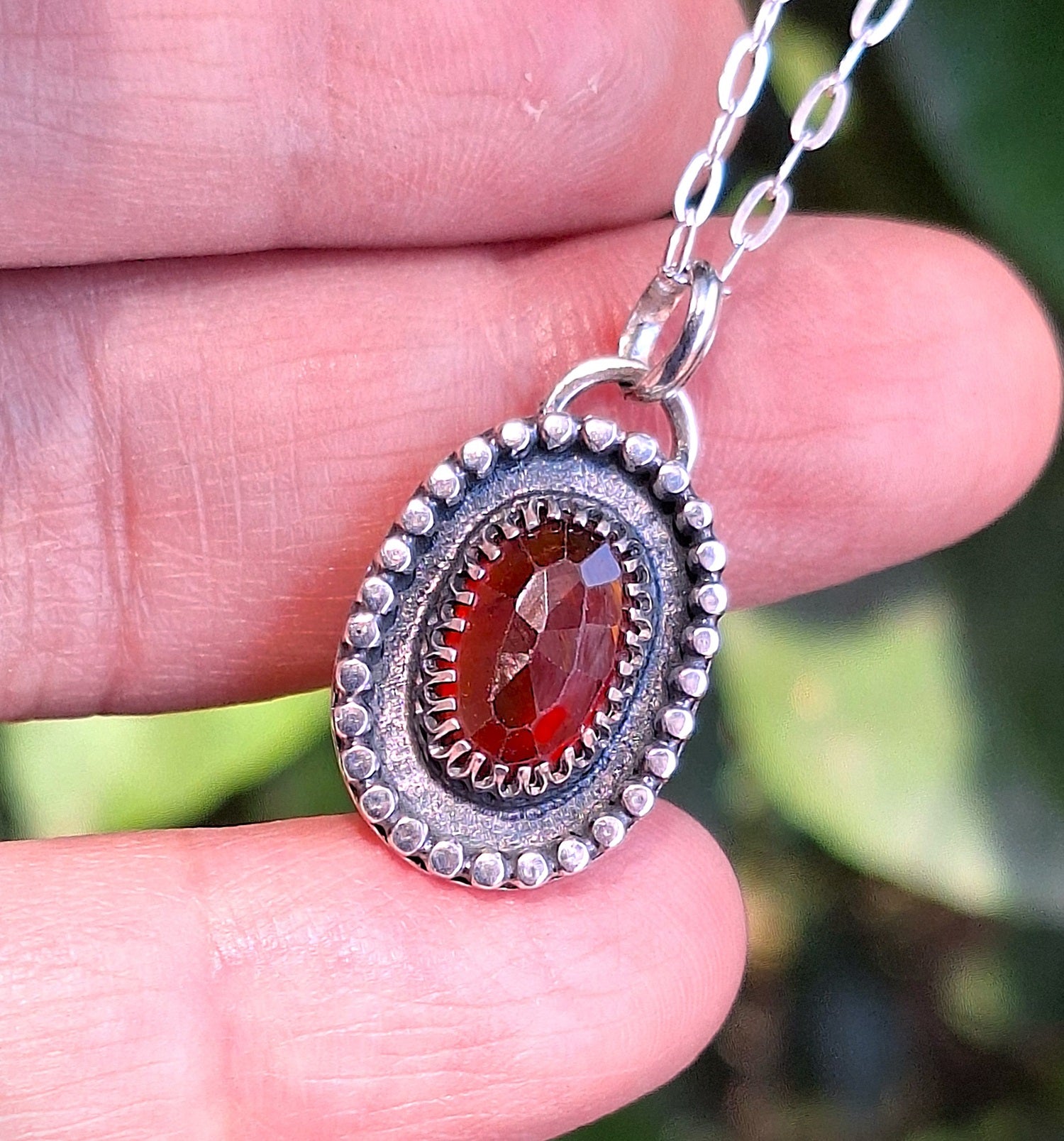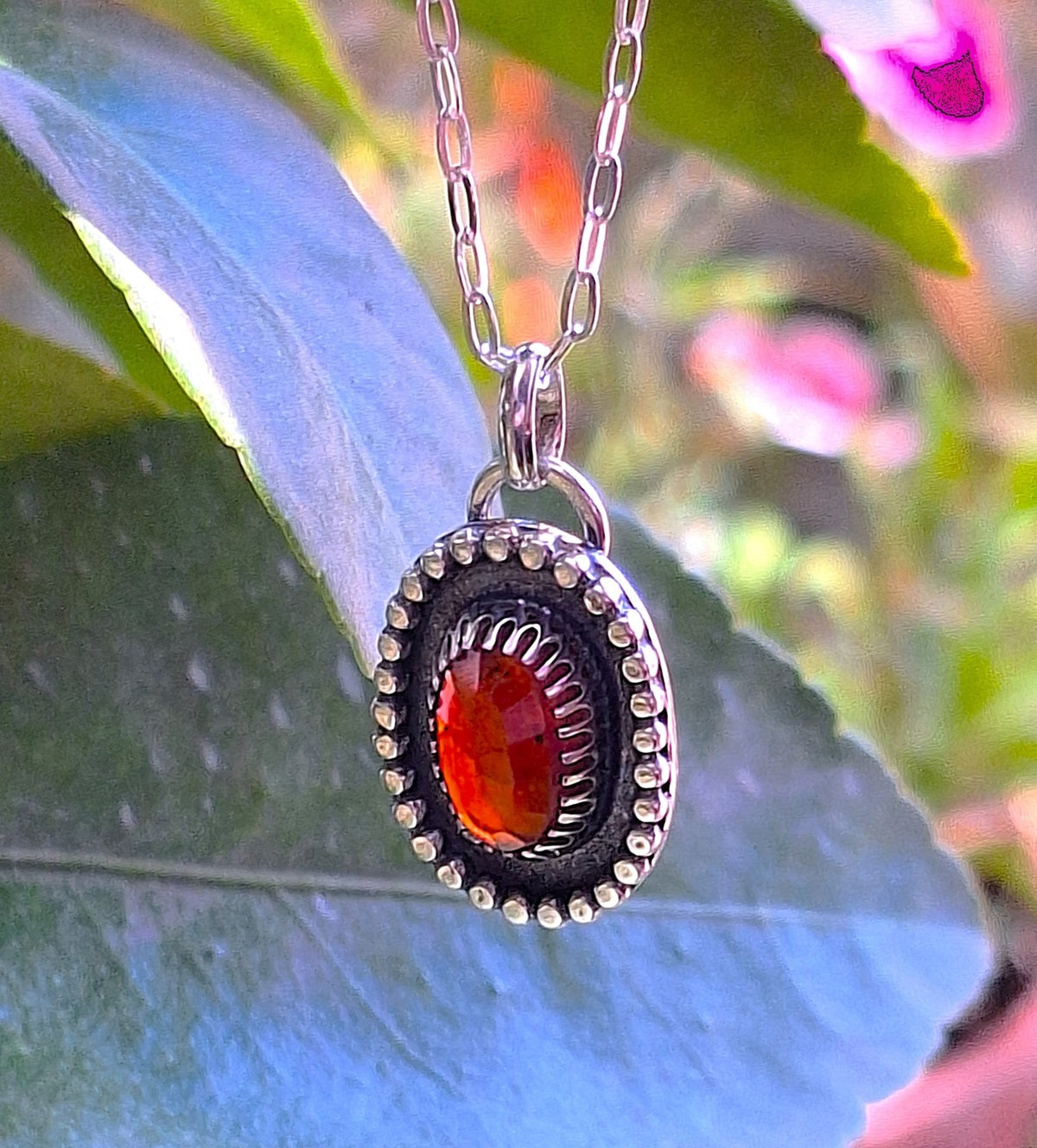 Colgante pequeño, hecho a mano, engaste de piedra natural Granate Hessonita. Incluye cadena de 45 cms. plata 925. Pieza única.