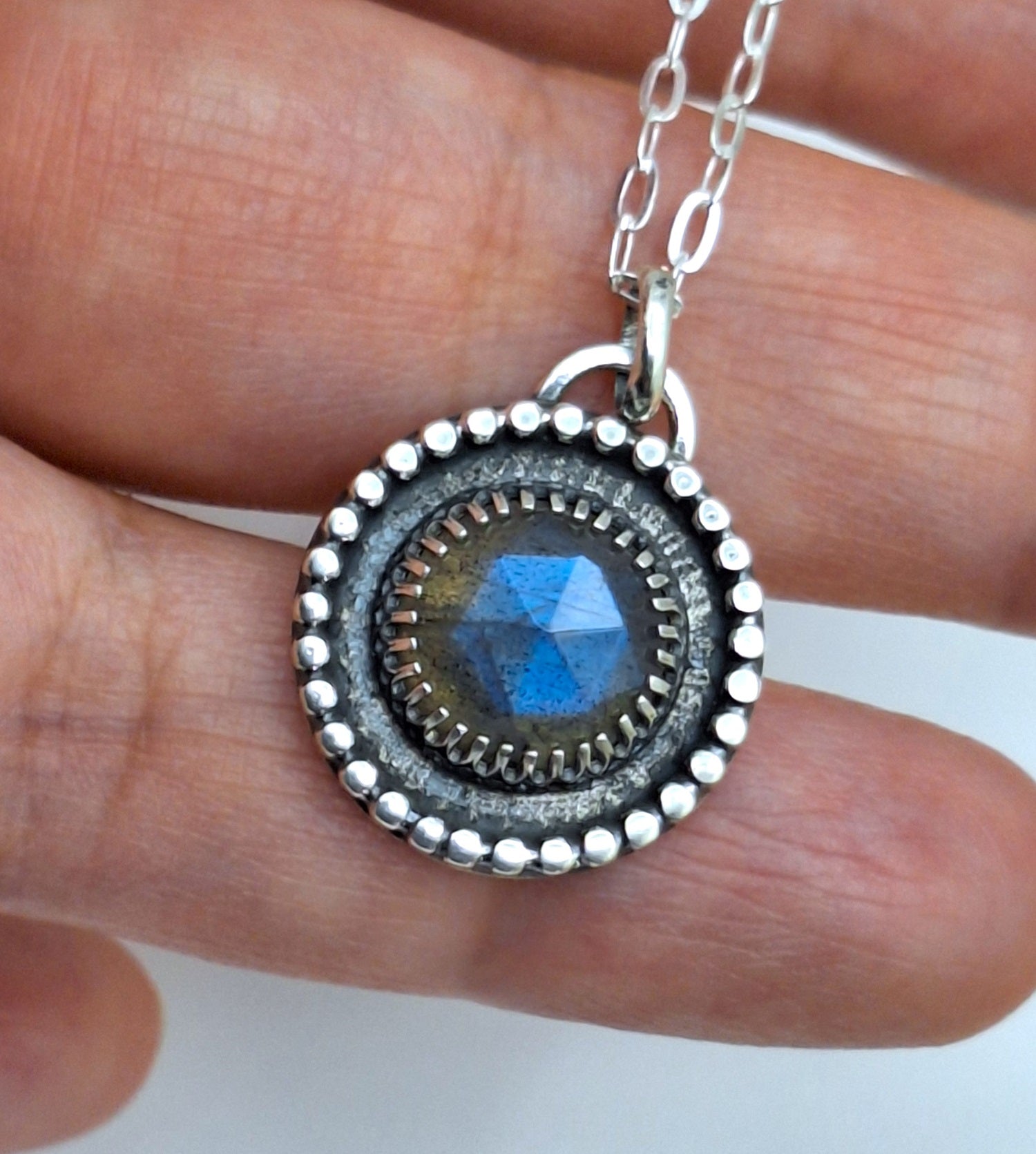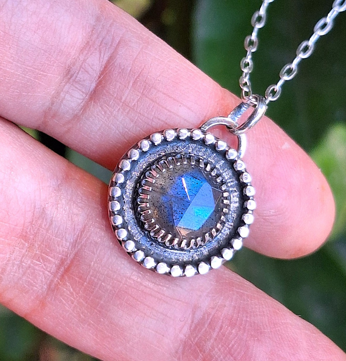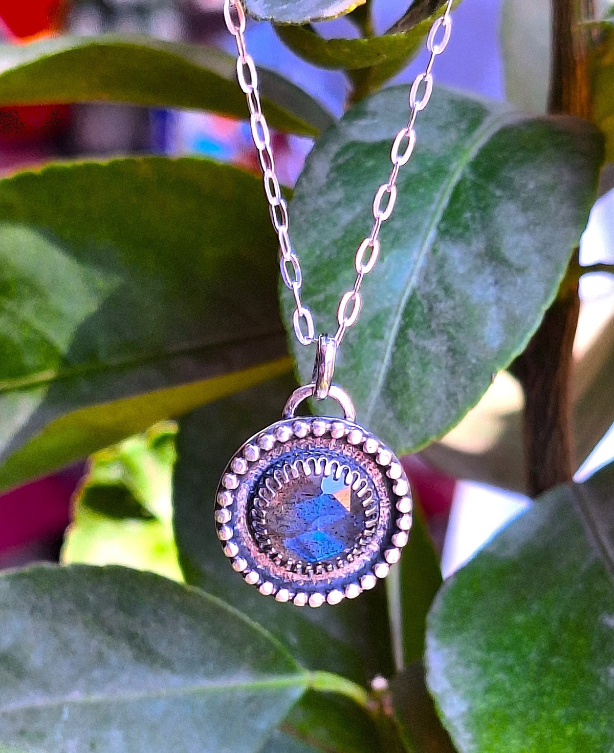Colgante amuleto pequeño, hecho a mano, engaste de piedra natural Labradorita. Incluye cadena de 45 cms. plata 925. Pieza única.