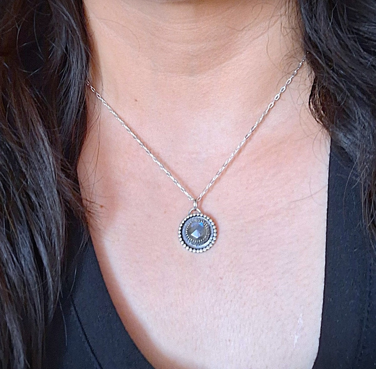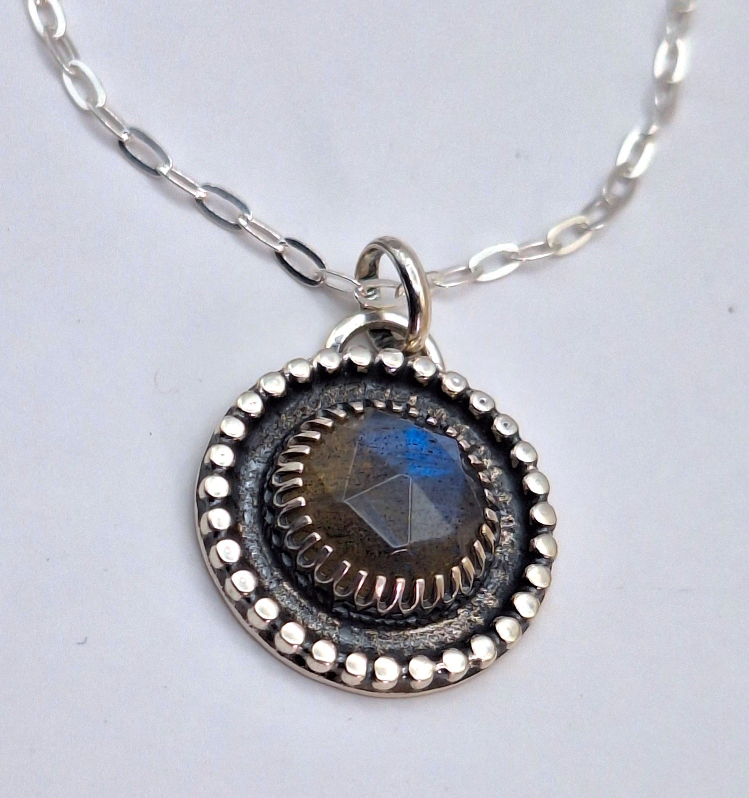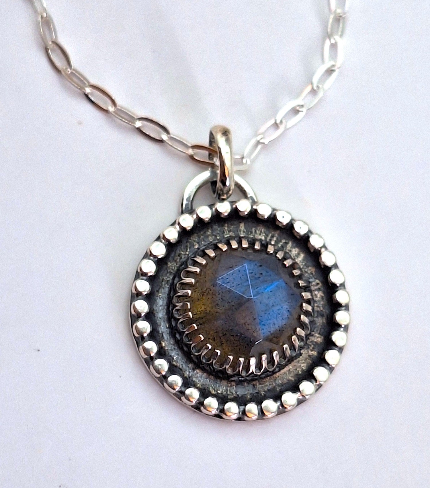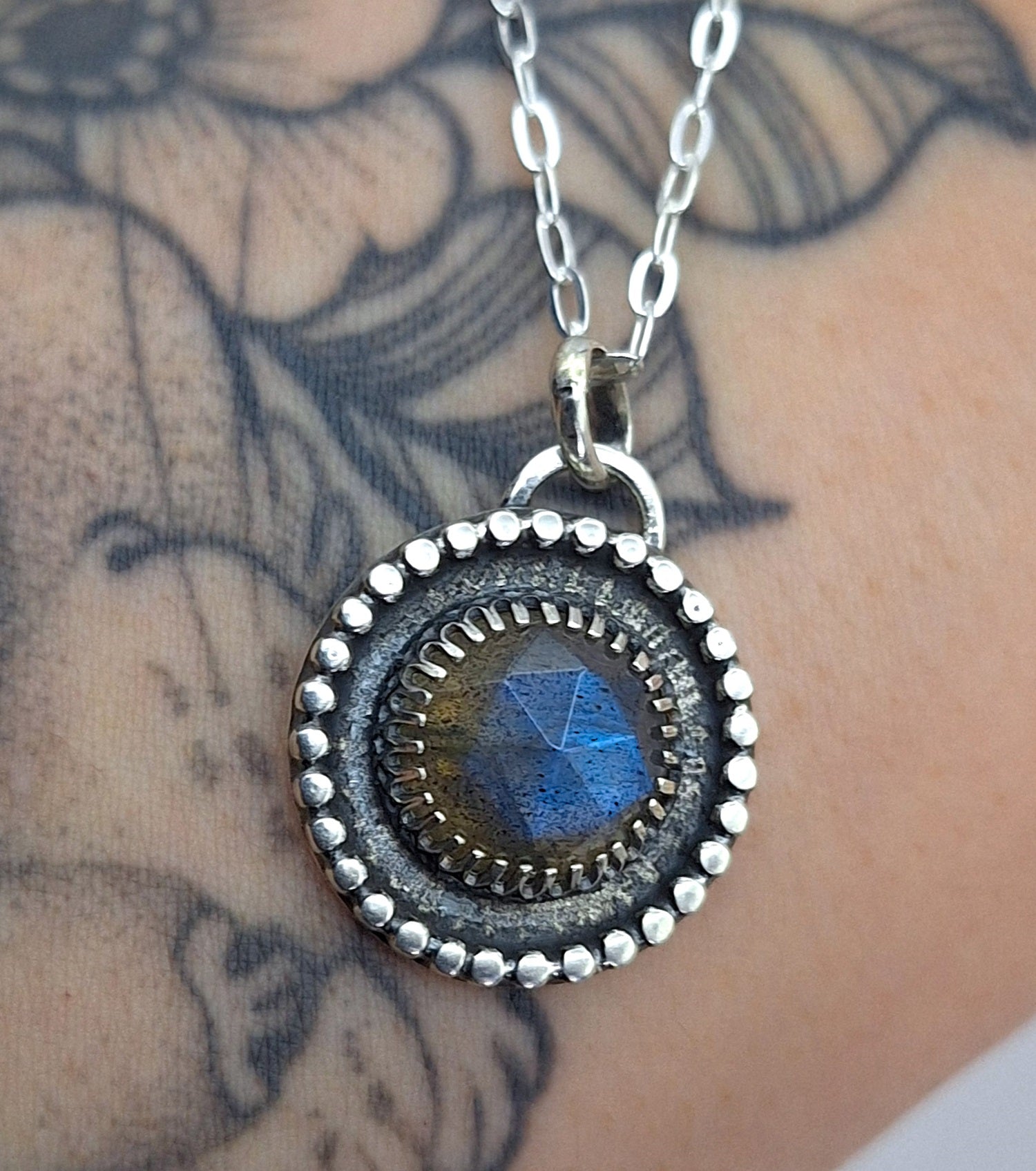 Colgante amuleto pequeño, hecho a mano, engaste de piedra natural Labradorita. Incluye cadena de 45 cms. plata 925. Pieza única.